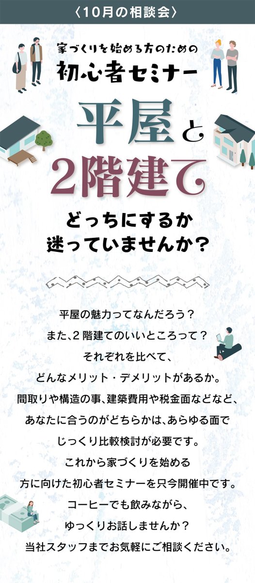 家づくり初心者向けセミナー開催中。平屋と2階建てのメリット・デメリットを建築費用や間取りまで比較し、あなたに合う住まいをプロがわかりやすく解説します。