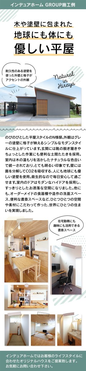 菌を分解しCO₂を吸収する塗壁を採用した、木の温もり溢れるナチュラルで衛生的な平屋。造作収納や書斎などこだわり満載の世界にひとつの住まい。