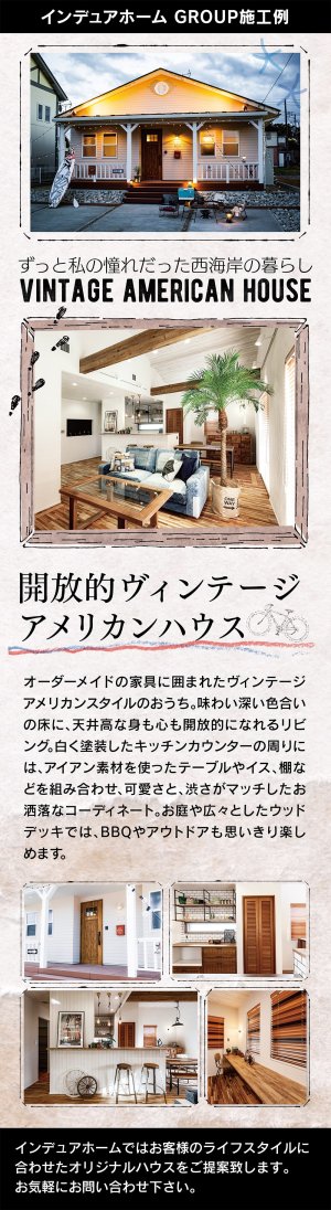 ヴィンテージスタイル、カリフォルニアスタイル、フレンチスタイル、プロヴァンススタイル、アメリカンスタイル、モダンスタイルの家のことなら、私たちインデュアホーム長崎中央が、こだわりの住宅を自信をもって心を込めておつくりします。