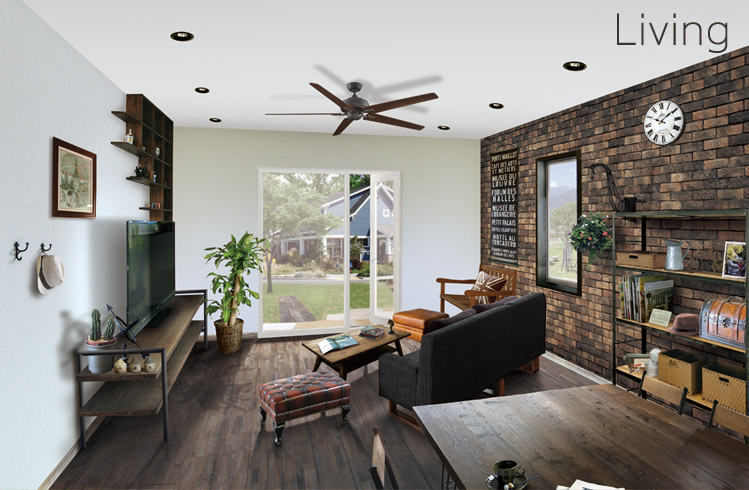 焼きむらのあるブリックタイルと、ウォルナットにカラーリングされたフロアがインダストリアルな雰囲気を演出。テラスドアからの風と光は、リビングを優しく包み込み、味わいのある素材を優しく照らす贅沢な時間を味わえる アーティスティックなリビング。